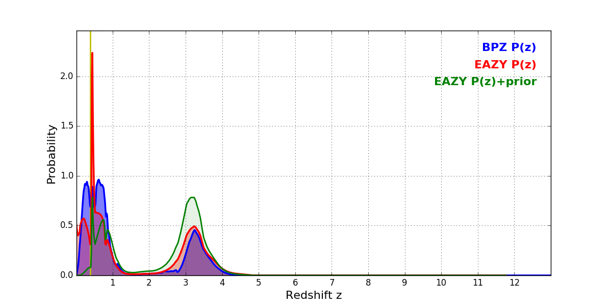 In P(z) plots: Yellow lines mark the cluster redshift z = 0.390,
