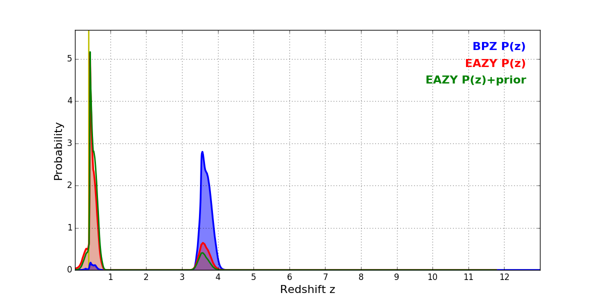 In P(z) plots: Yellow lines mark the cluster redshift z = 0.390,