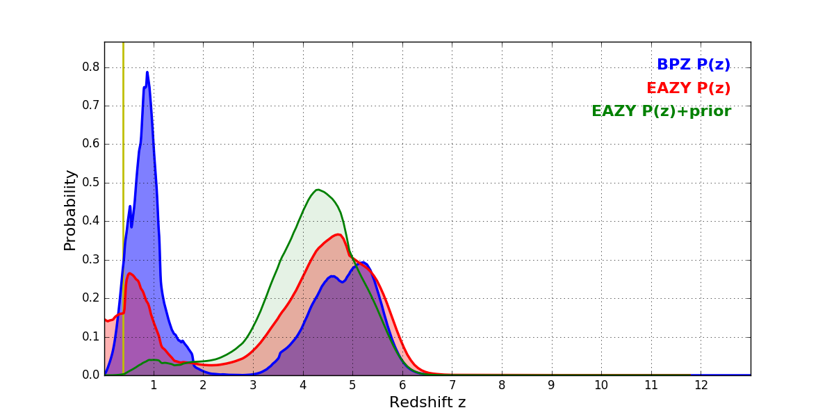 In P(z) plots: Yellow lines mark the cluster redshift z = 0.390,