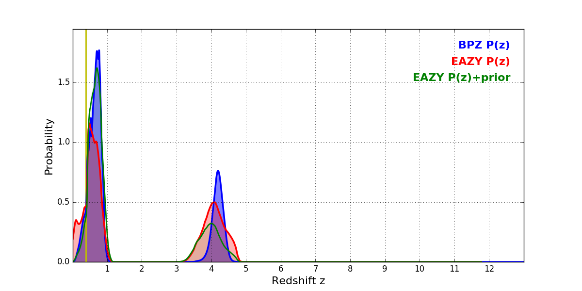 In P(z) plots: Yellow lines mark the cluster redshift z = 0.390,