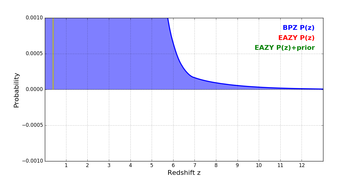 In P(z) plots: Yellow lines mark the cluster redshift z = 0.390,