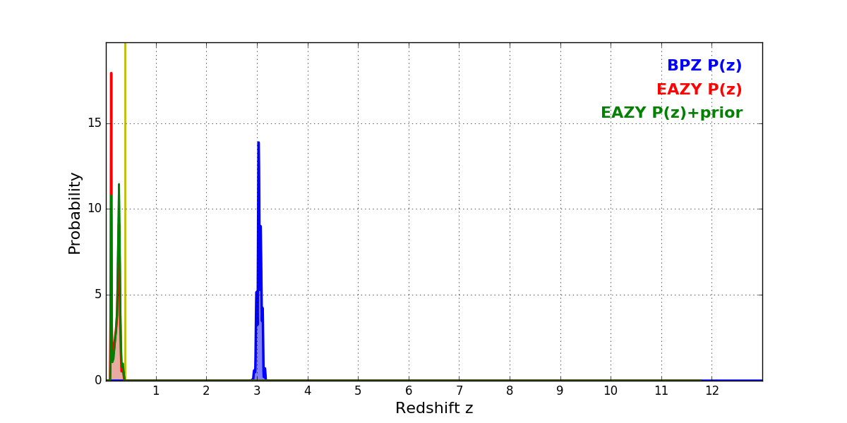 In P(z) plots: Yellow lines mark the cluster redshift z = 0.390,