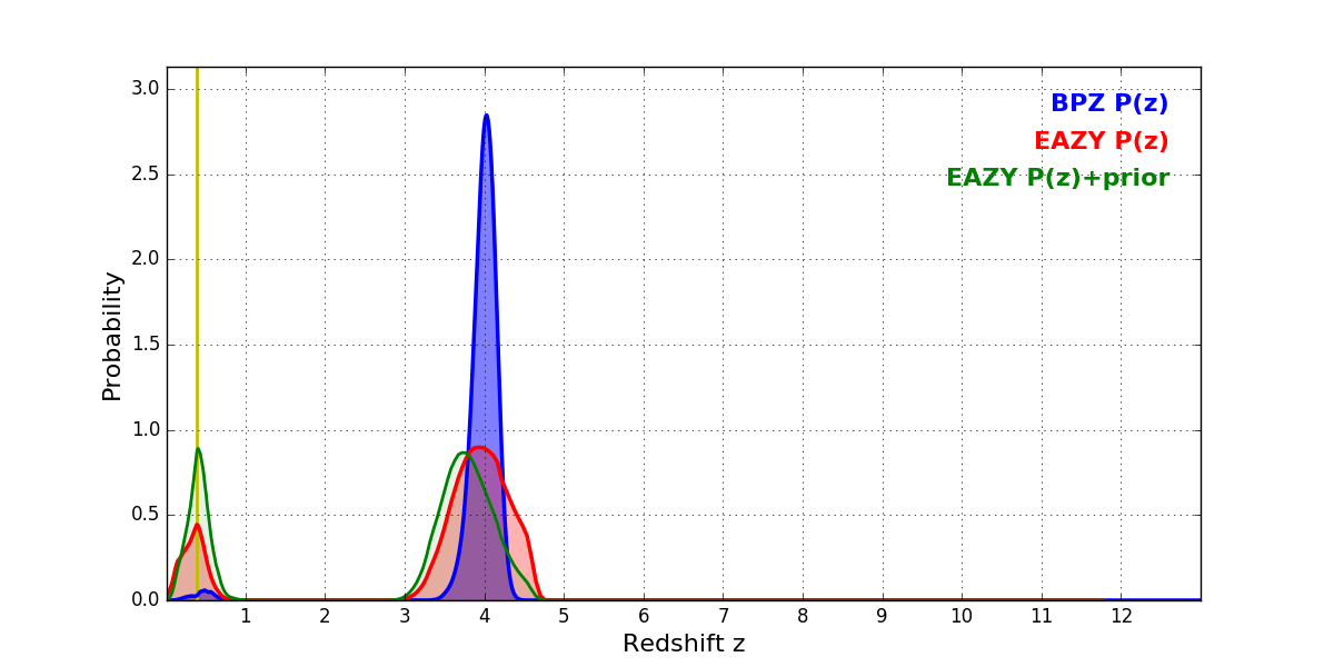 In P(z) plots: Yellow lines mark the cluster redshift z = 0.390,