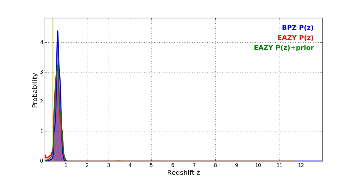 In P(z) plots: Yellow lines mark the cluster redshift z = 0.390,