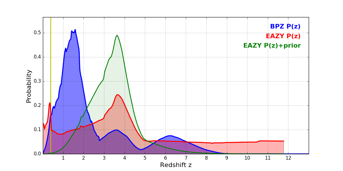 In P(z) plots: Yellow lines mark the cluster redshift z = 0.390,