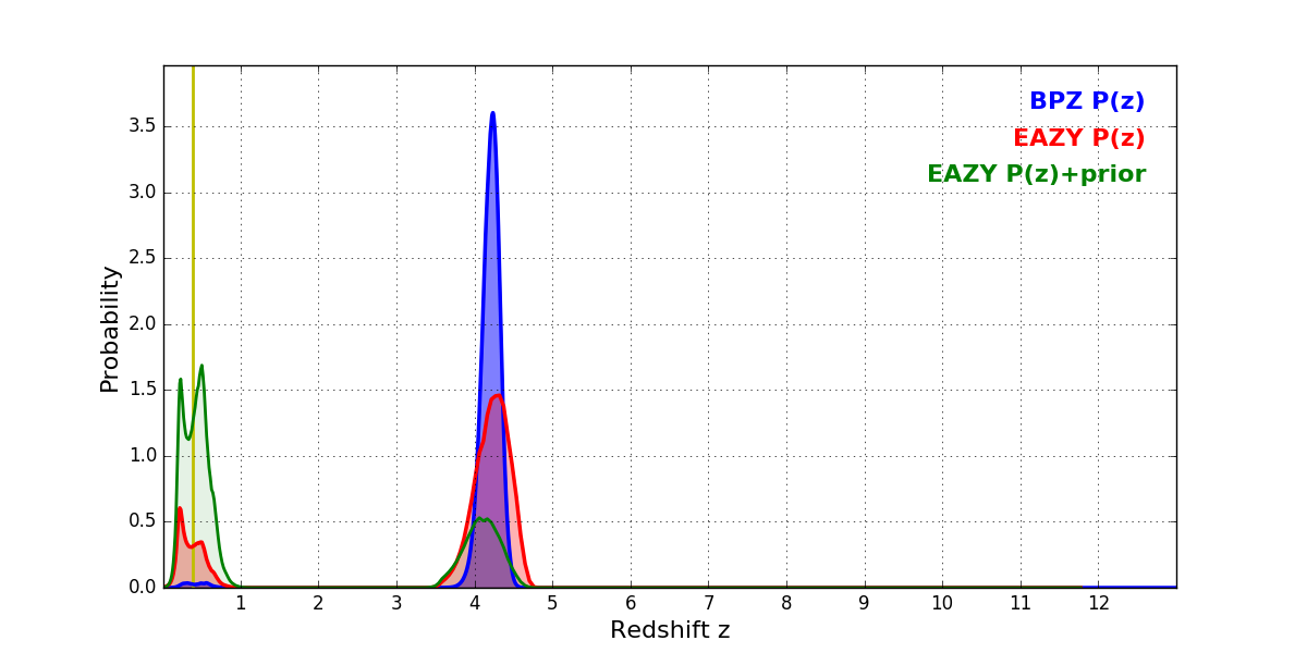 In P(z) plots: Yellow lines mark the cluster redshift z = 0.390,