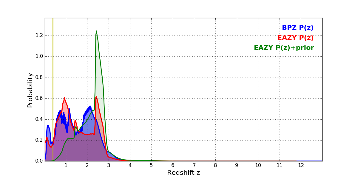 In P(z) plots: Yellow lines mark the cluster redshift z = 0.390,