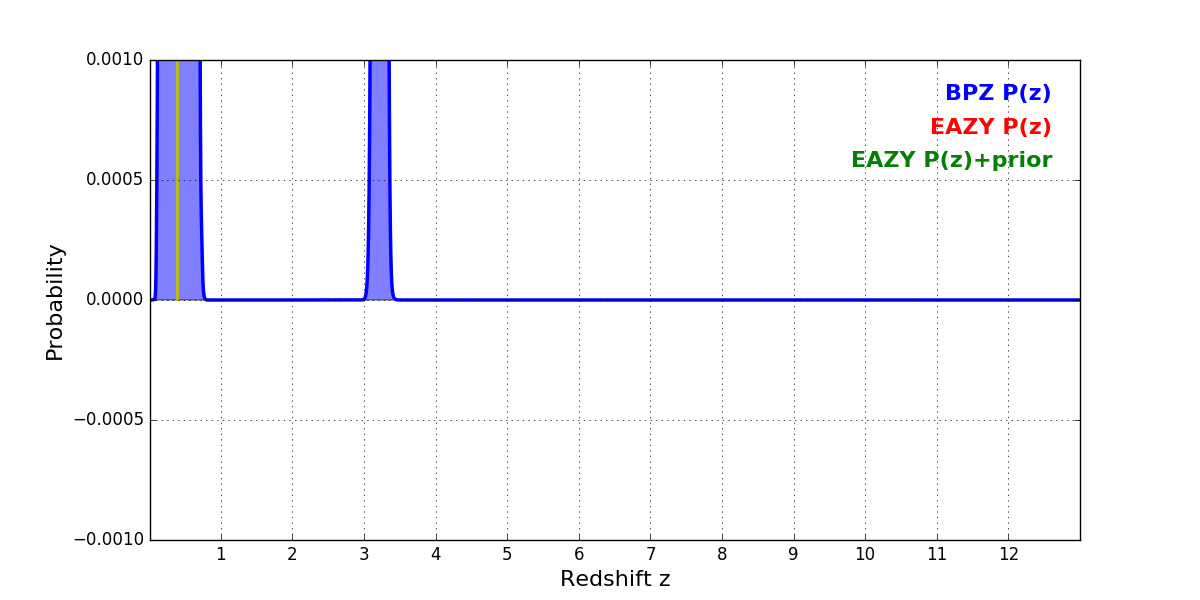 In P(z) plots: Yellow lines mark the cluster redshift z = 0.390,