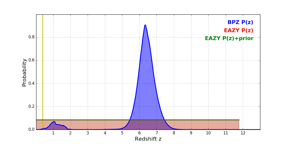 In P(z) plots: Yellow lines mark the cluster redshift z = 0.390,