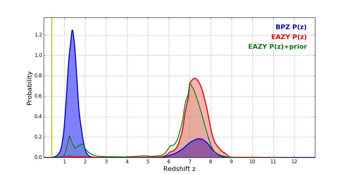 In P(z) plots: Yellow lines mark the cluster redshift z = 0.390,