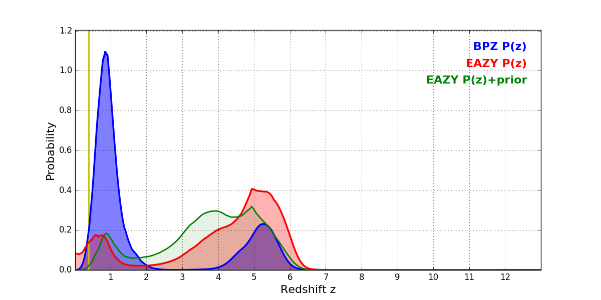 In P(z) plots: Yellow lines mark the cluster redshift z = 0.390,