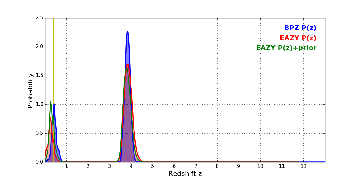 In P(z) plots: Yellow lines mark the cluster redshift z = 0.390,