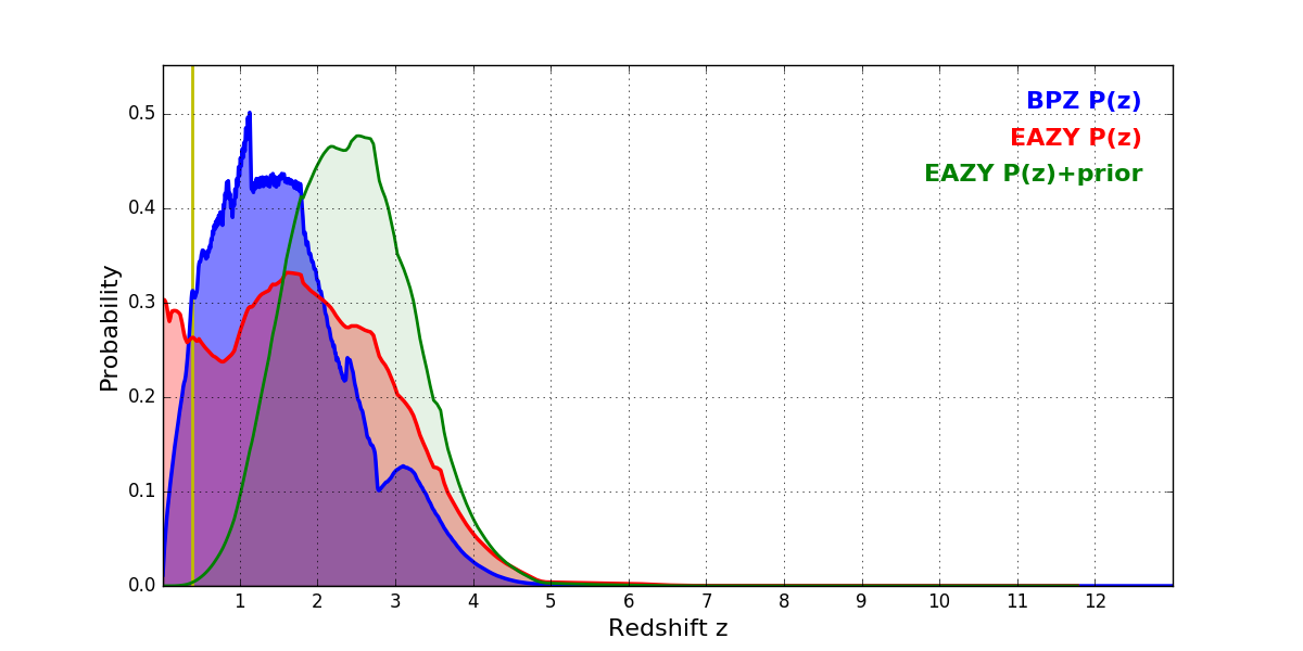 In P(z) plots: Yellow lines mark the cluster redshift z = 0.390,