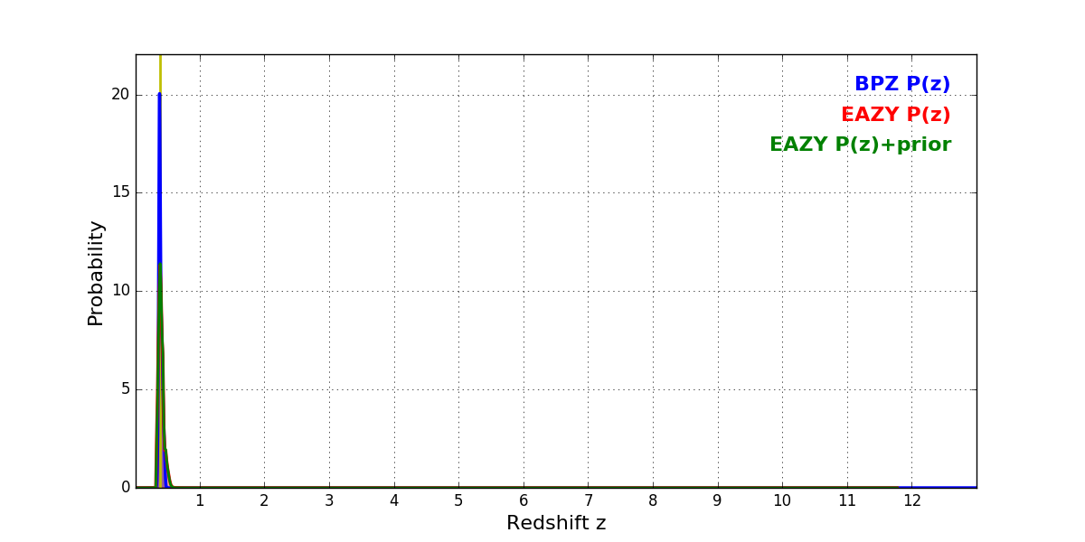In P(z) plots: Yellow lines mark the cluster redshift z = 0.390,