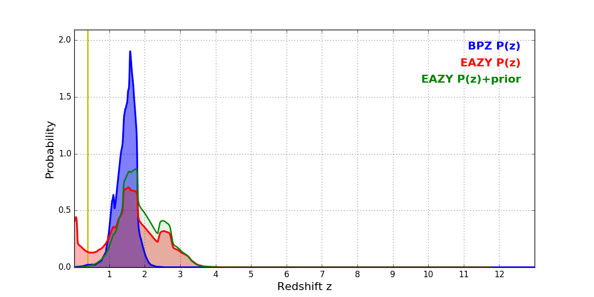 In P(z) plots: Yellow lines mark the cluster redshift z = 0.390,