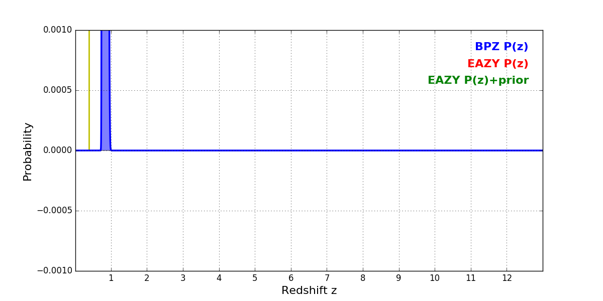 In P(z) plots: Yellow lines mark the cluster redshift z = 0.390,