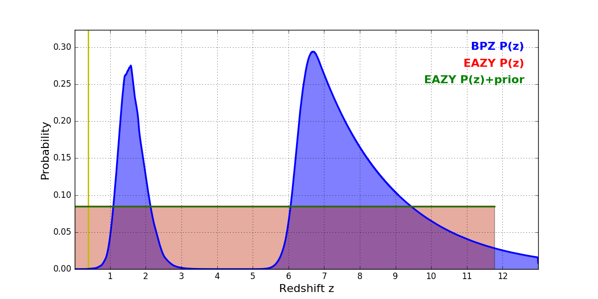 In P(z) plots: Yellow lines mark the cluster redshift z = 0.390,