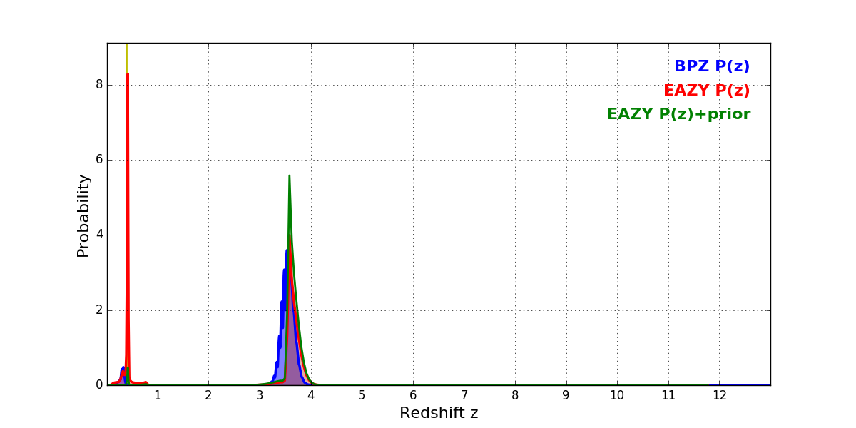In P(z) plots: Yellow lines mark the cluster redshift z = 0.390,
