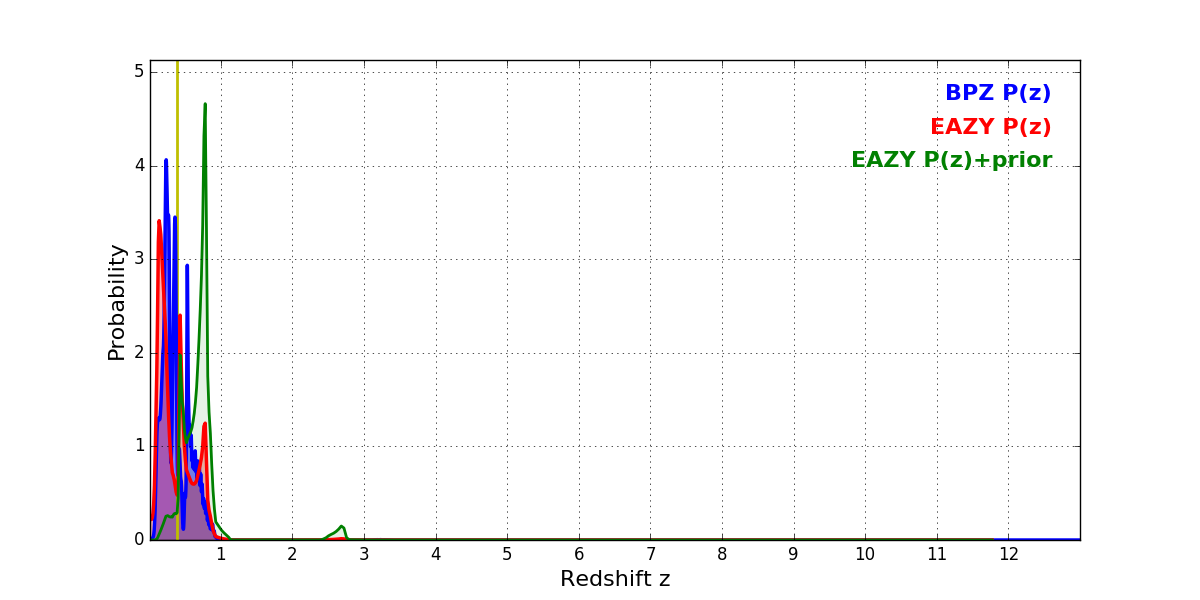 In P(z) plots: Yellow lines mark the cluster redshift z = 0.390,