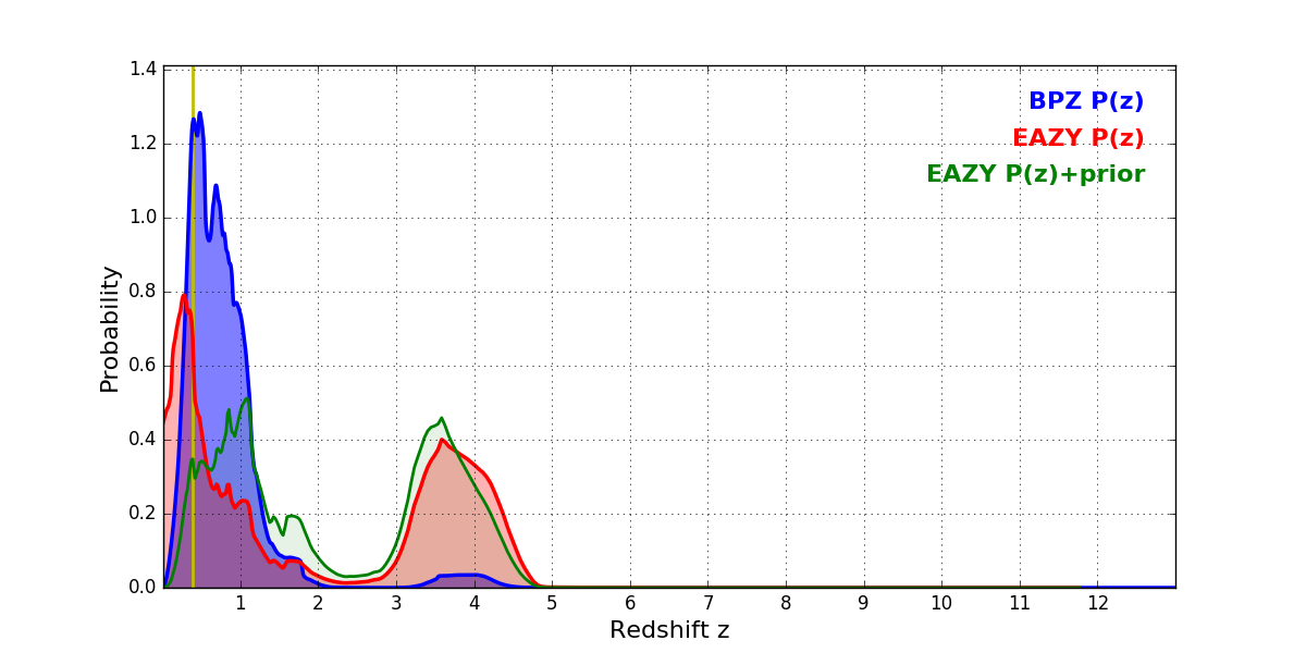 In P(z) plots: Yellow lines mark the cluster redshift z = 0.390,