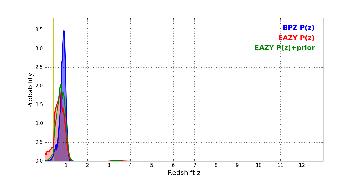 In P(z) plots: Yellow lines mark the cluster redshift z = 0.390,