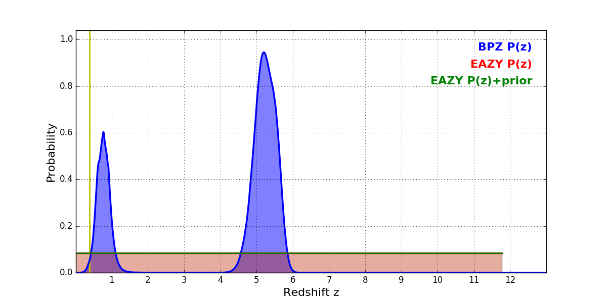 In P(z) plots: Yellow lines mark the cluster redshift z = 0.390,