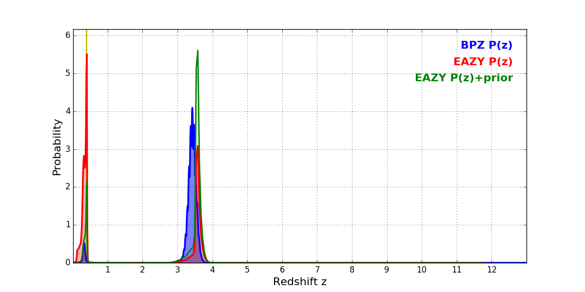 In P(z) plots: Yellow lines mark the cluster redshift z = 0.390,