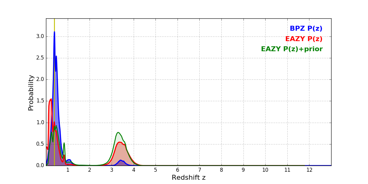 In P(z) plots: Yellow lines mark the cluster redshift z = 0.390,