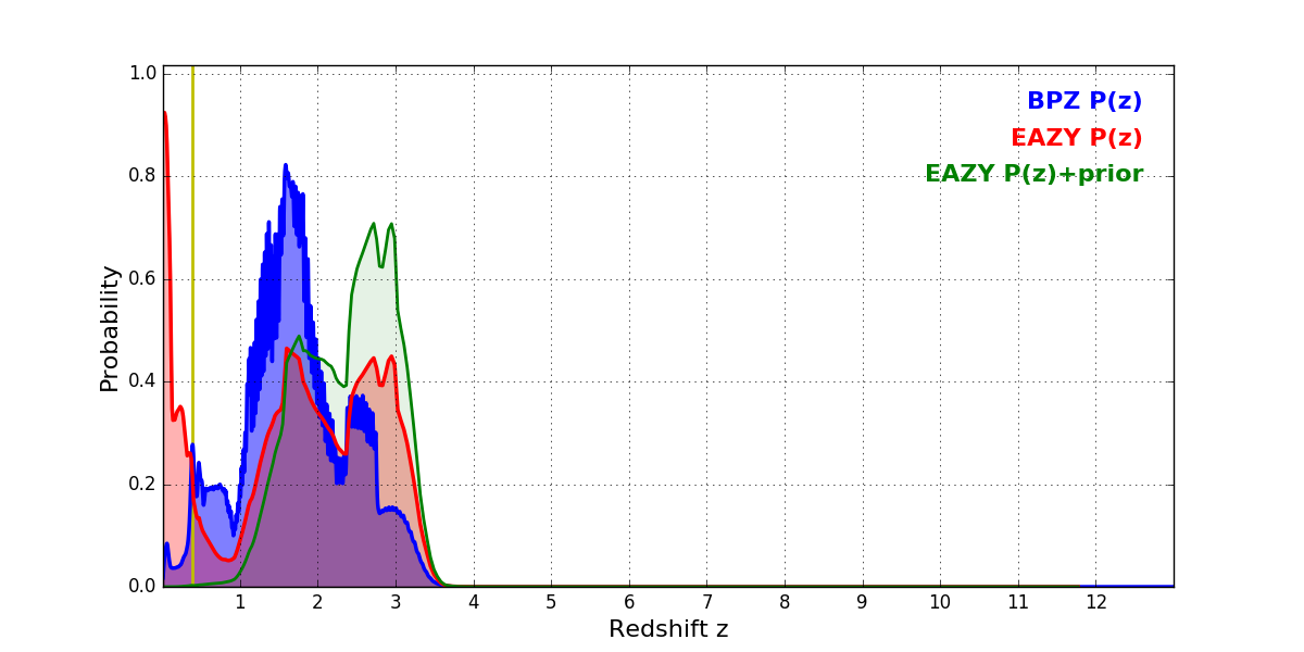 In P(z) plots: Yellow lines mark the cluster redshift z = 0.390,