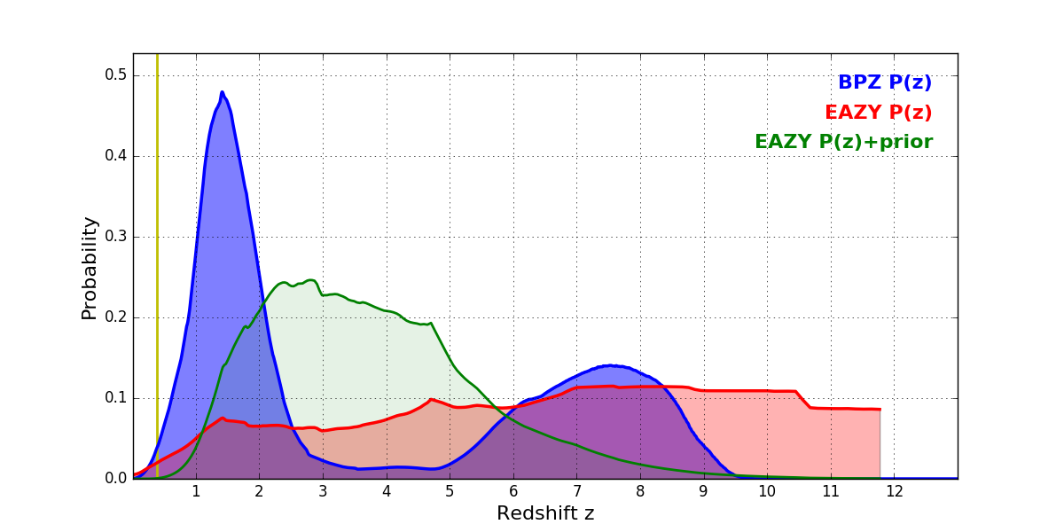 In P(z) plots: Yellow lines mark the cluster redshift z = 0.390,