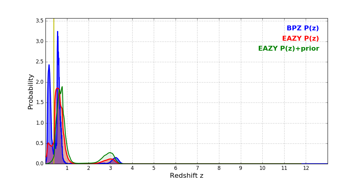 In P(z) plots: Yellow lines mark the cluster redshift z = 0.390,