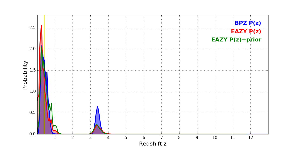In P(z) plots: Yellow lines mark the cluster redshift z = 0.390,