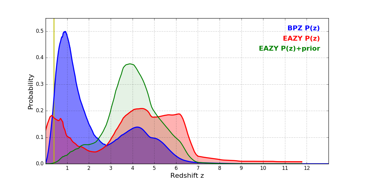 In P(z) plots: Yellow lines mark the cluster redshift z = 0.390,