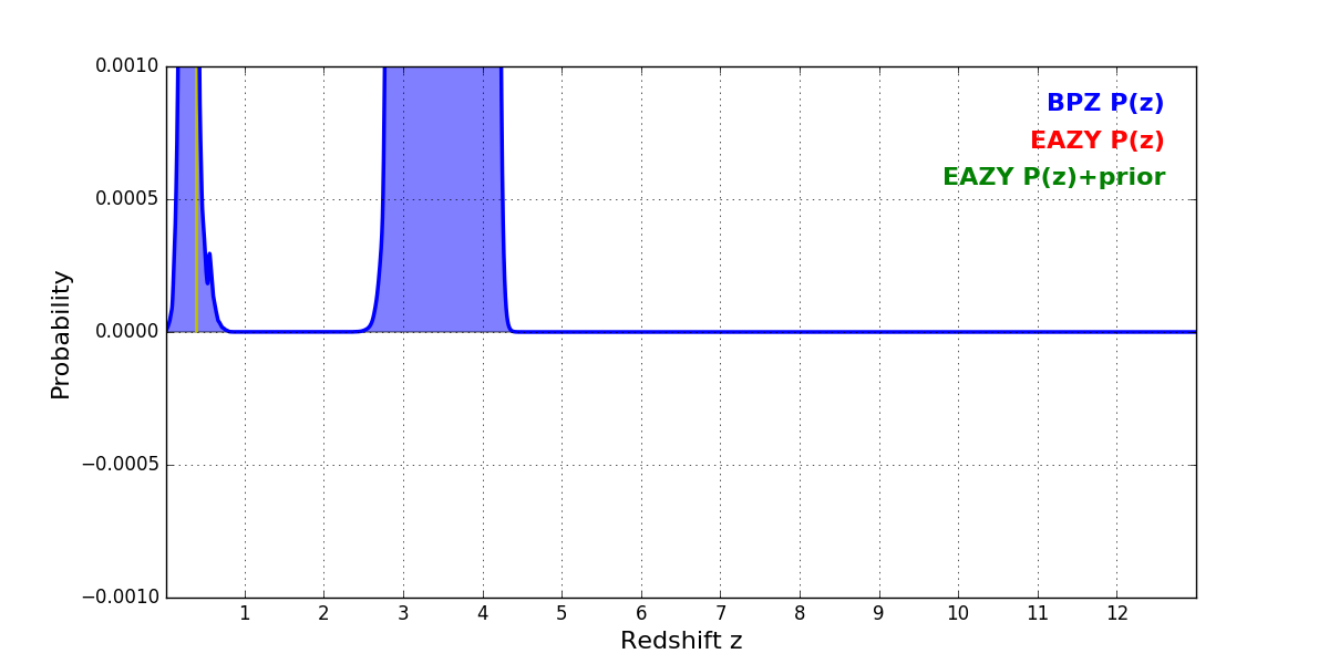 In P(z) plots: Yellow lines mark the cluster redshift z = 0.390,