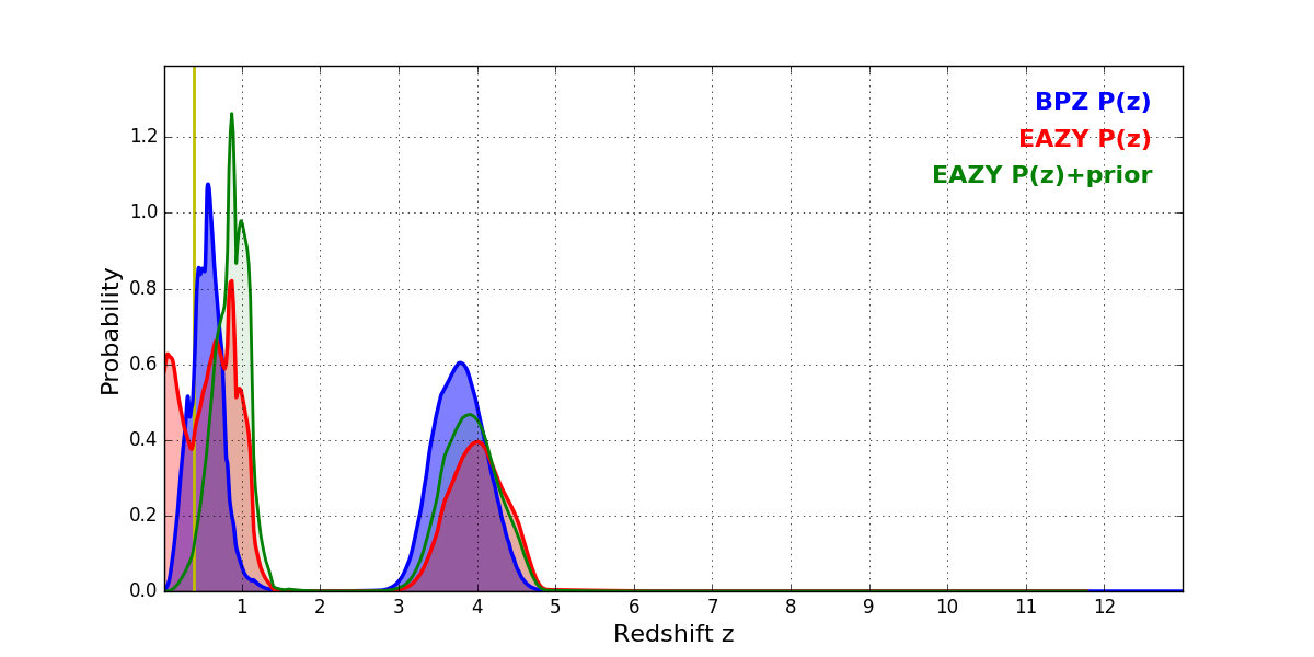 In P(z) plots: Yellow lines mark the cluster redshift z = 0.390,