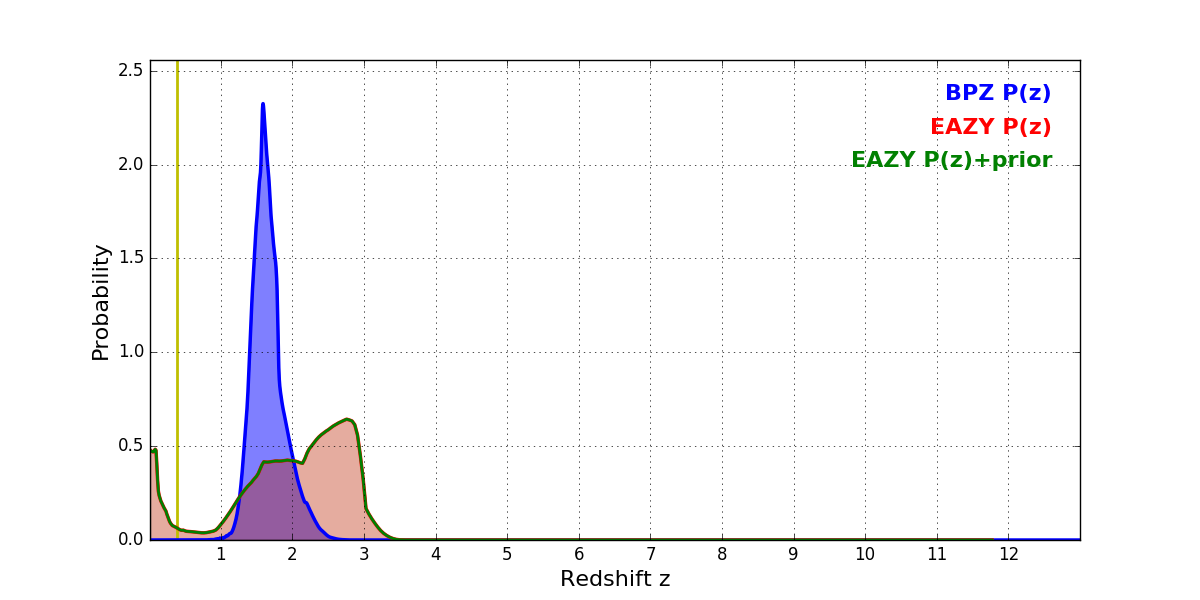 In P(z) plots: Yellow lines mark the cluster redshift z = 0.390,
