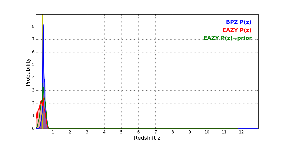 In P(z) plots: Yellow lines mark the cluster redshift z = 0.390,