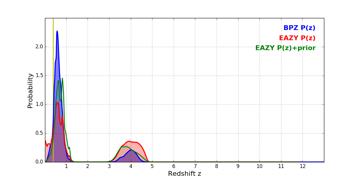 In P(z) plots: Yellow lines mark the cluster redshift z = 0.390,