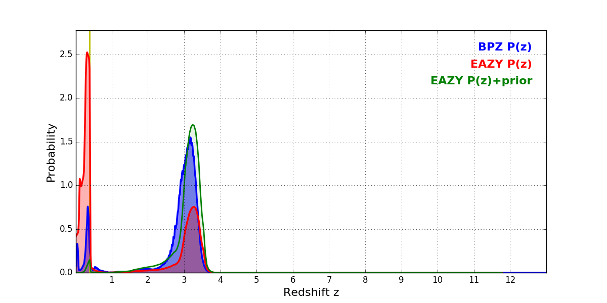 In P(z) plots: Yellow lines mark the cluster redshift z = 0.390,