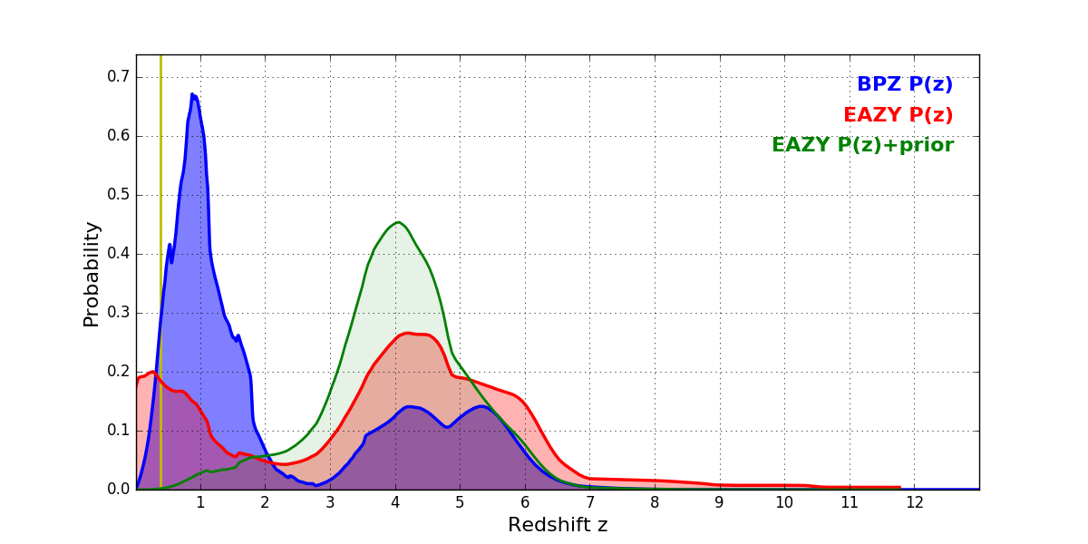 In P(z) plots: Yellow lines mark the cluster redshift z = 0.390,