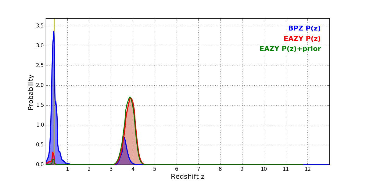 In P(z) plots: Yellow lines mark the cluster redshift z = 0.390,