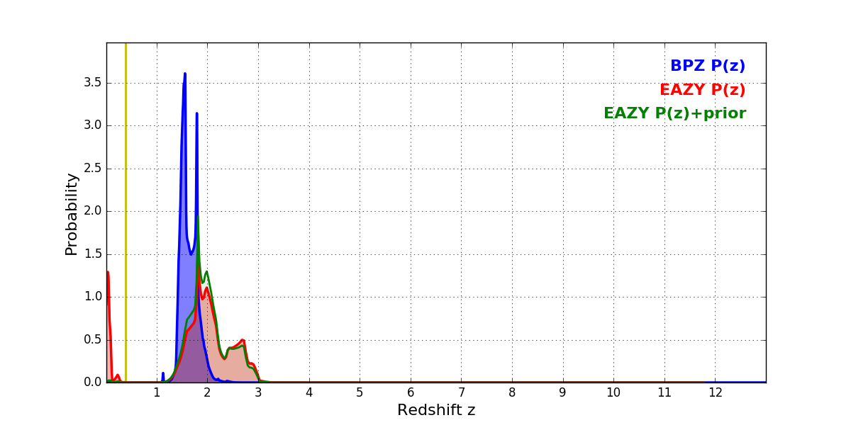 In P(z) plots: Yellow lines mark the cluster redshift z = 0.390,
