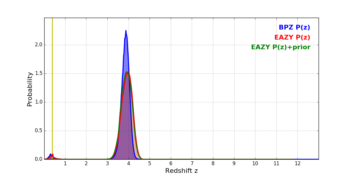 In P(z) plots: Yellow lines mark the cluster redshift z = 0.390,
