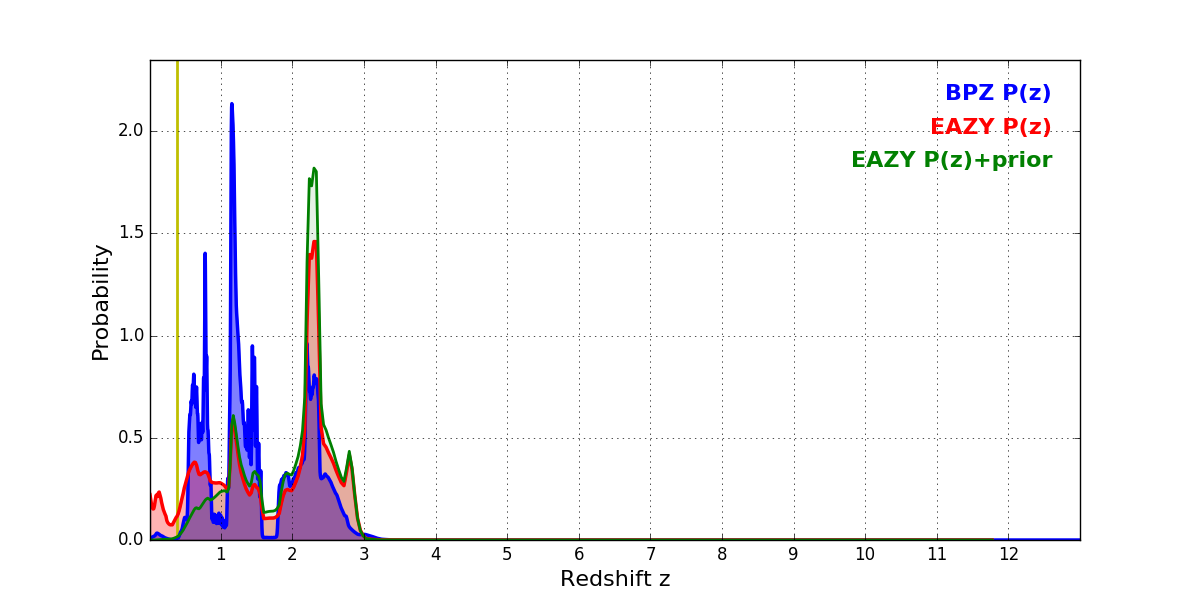 In P(z) plots: Yellow lines mark the cluster redshift z = 0.390,