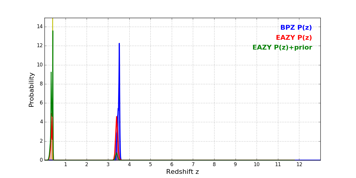 In P(z) plots: Yellow lines mark the cluster redshift z = 0.390,