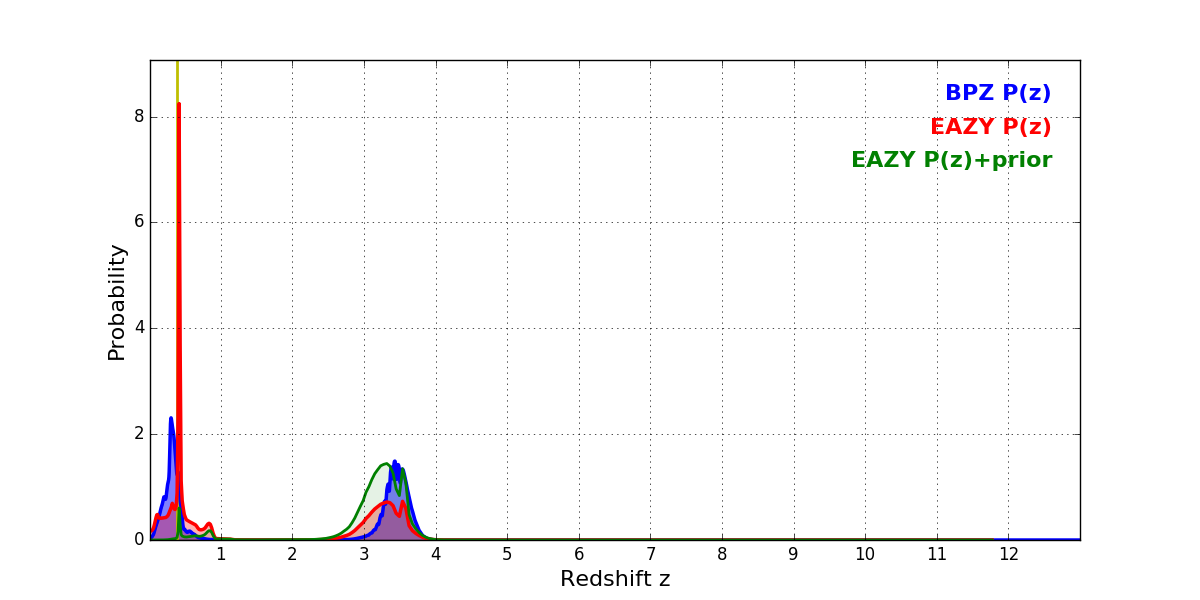 In P(z) plots: Yellow lines mark the cluster redshift z = 0.390,