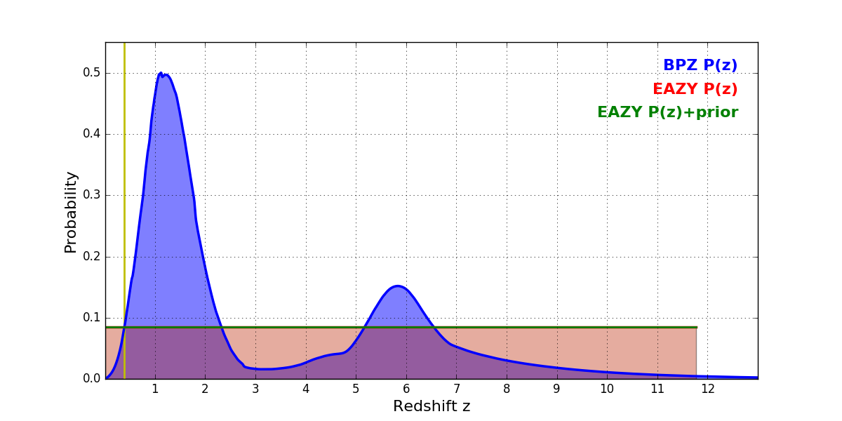 In P(z) plots: Yellow lines mark the cluster redshift z = 0.390,