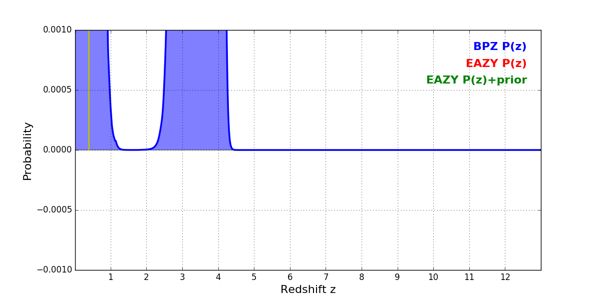 In P(z) plots: Yellow lines mark the cluster redshift z = 0.390,