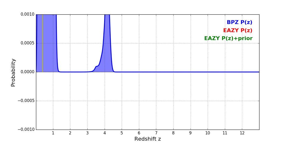 In P(z) plots: Yellow lines mark the cluster redshift z = 0.390,
