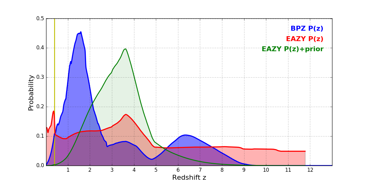 In P(z) plots: Yellow lines mark the cluster redshift z = 0.390,